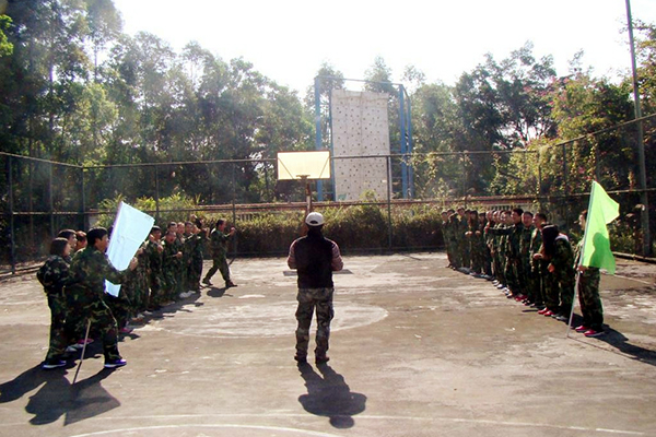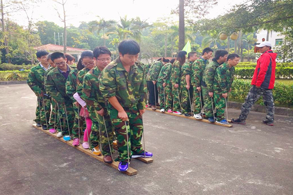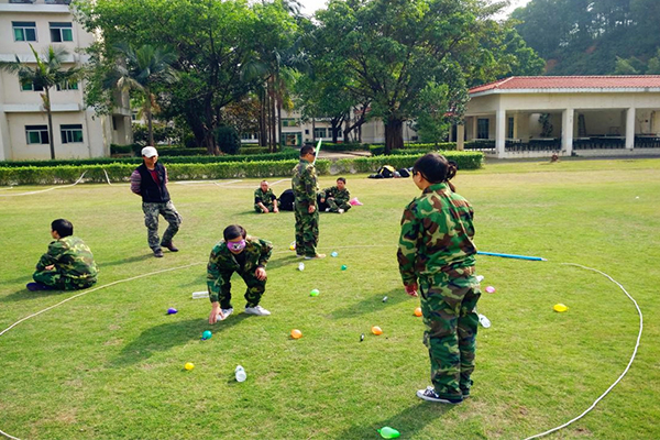 這個項目是模擬戰(zhàn)場,三人一組,分別扮演:司令(不能說話、面朝戰(zhàn)場)、參謀長(背對戰(zhàn)場)、士兵(蒙上眼罩,不能說話)。