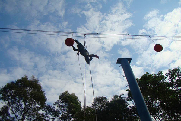 學員爬上7米高的跳臺,在跳臺上奮力跳出拍打汽球。這個項目主要訓練學員克服心理障礙、建立良好的心理素質(zhì)及自信心,果斷的
